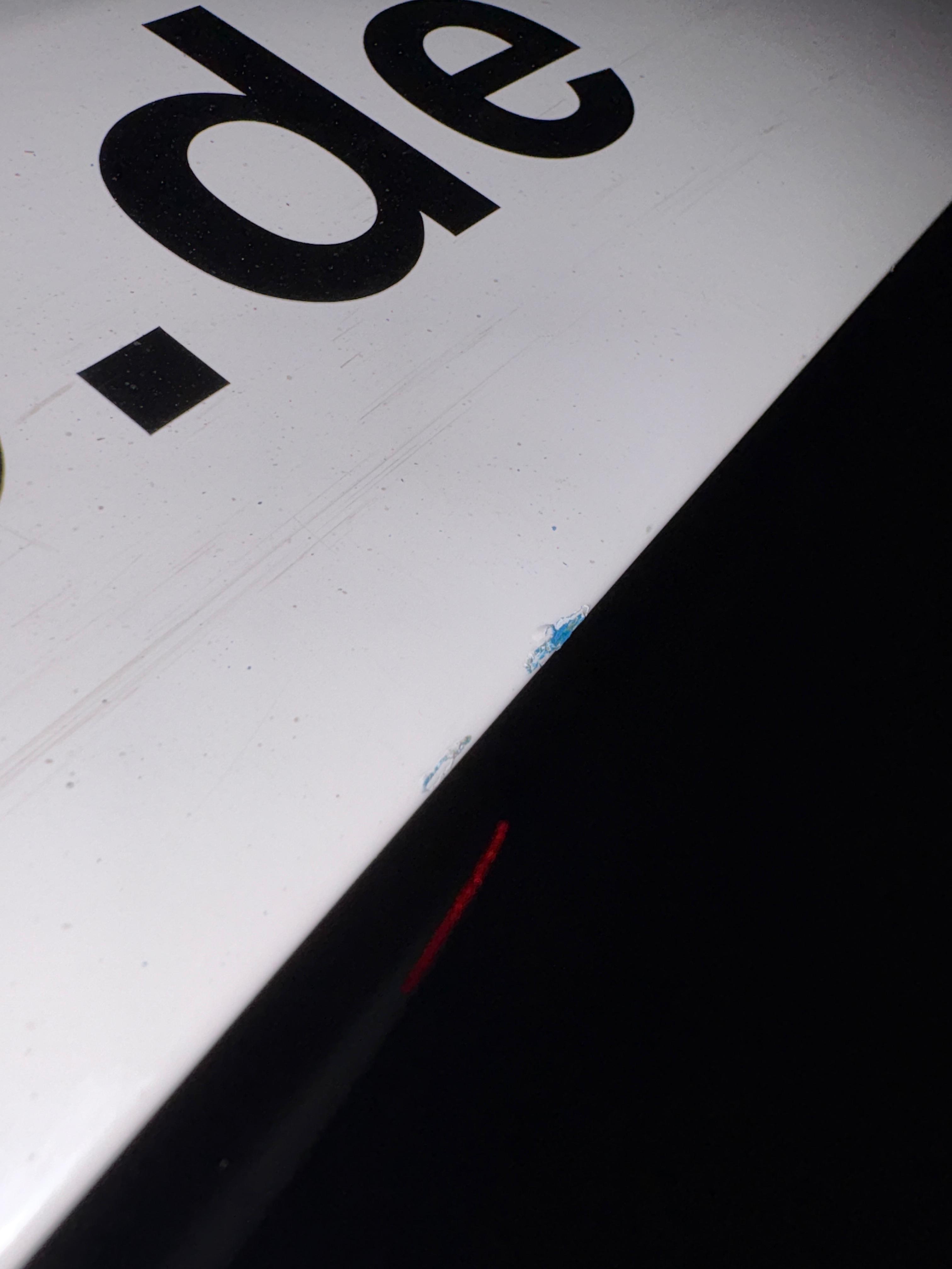 Lack-/Folierungsschaden Heckklappe. Leider habe ich nicht bedacht, dass das Drohnenauto näher an der Wand steht als sonst, und habe zu schwungvoll die Heckklappe geöffnet. Jetzt hat sie eine Fingernagelbreiten Lackschaden.
